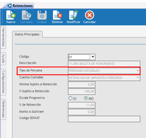 - Las de Honorarios, al crearlas, deberán definirlas para el Tipo de Personas Naturales, de modo que sea calculada al Registrar las Facturas del Proveedor.