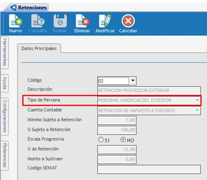 2. La retencion a proveedores del Exterior, se debe definir para el Tipo de Personas Jurídicas del Exterior, de modo que sea calculada al Pago de las Facturas del Proveedor del exterior.
