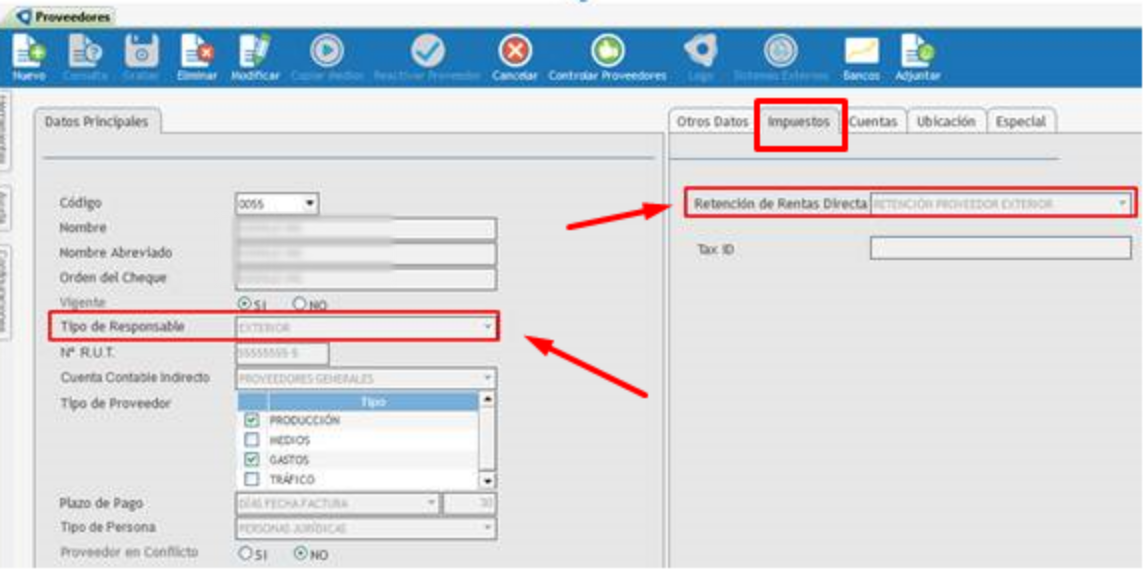 Una vez creada, en aquellos proveedores que corresponda retenerles, deberá irse al Maestro del Proveedores y asociarle la retención creada a tal efecto, tal cual se visualiza en las imágenes: