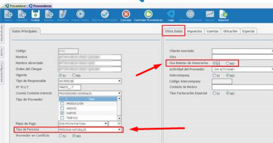 Una vez creada, para que funcione en forma automática se debe asignar en el maestro de proveedores a cuales corresponde retener, tildando en ‘SI’ Usa Boleta de Honorarios y asociarle la retención creada a tal efecto, tal cual se visualiza en las imágenes: