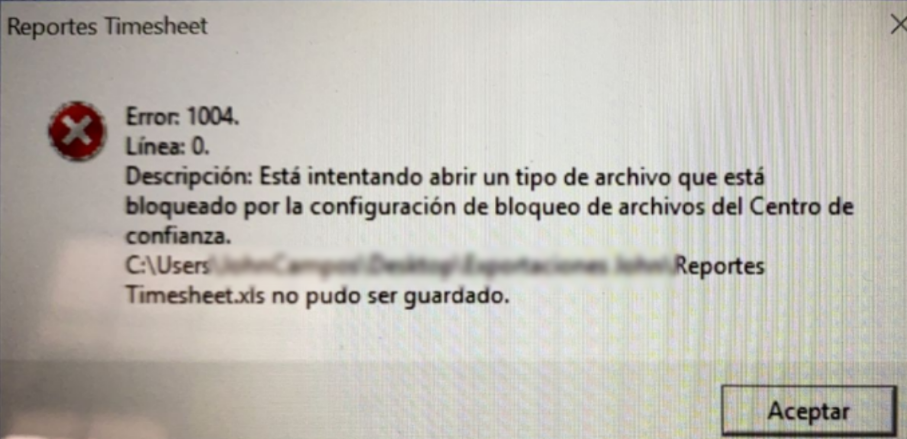 Al tratar de Exportar un reporte a Excel manda el error 1004 indicando que el sistema esta intentando abrir un tipo de archivos, que esta bloqueado por la configuración de archivos del Centro de Confianza y no deja exportarlo