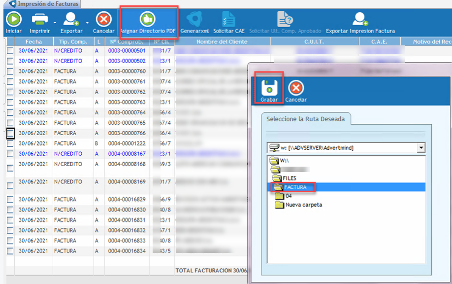Dentro de la Impresión de Facturas, permite configurar la ruta de la carpeta donde se guardan los comprobantes PDF.