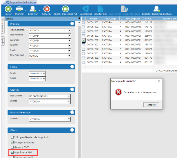 El error puede presentarse porque la ruta hacia la carpeta donde se guardan los comprobantes en PDF ya no existe o no es accesible por este equipo/usuario.