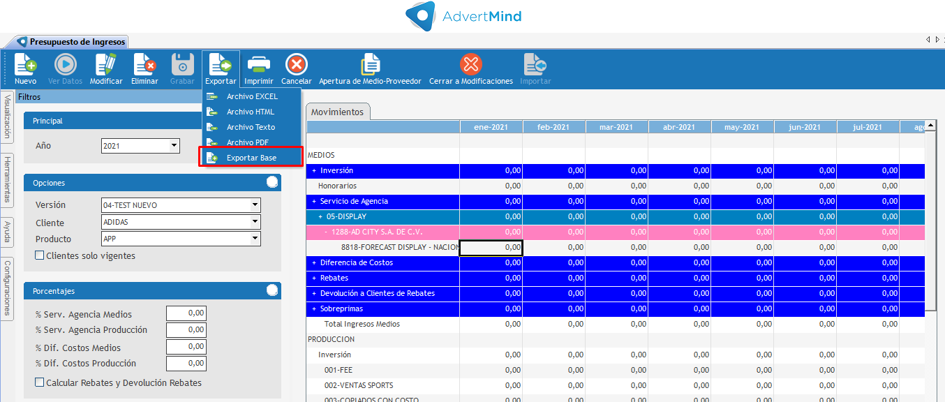 Para el uso de la exportación e importación de la base es necesario tener activa y en uso la pantalla de Presupuesto de ingresos.
