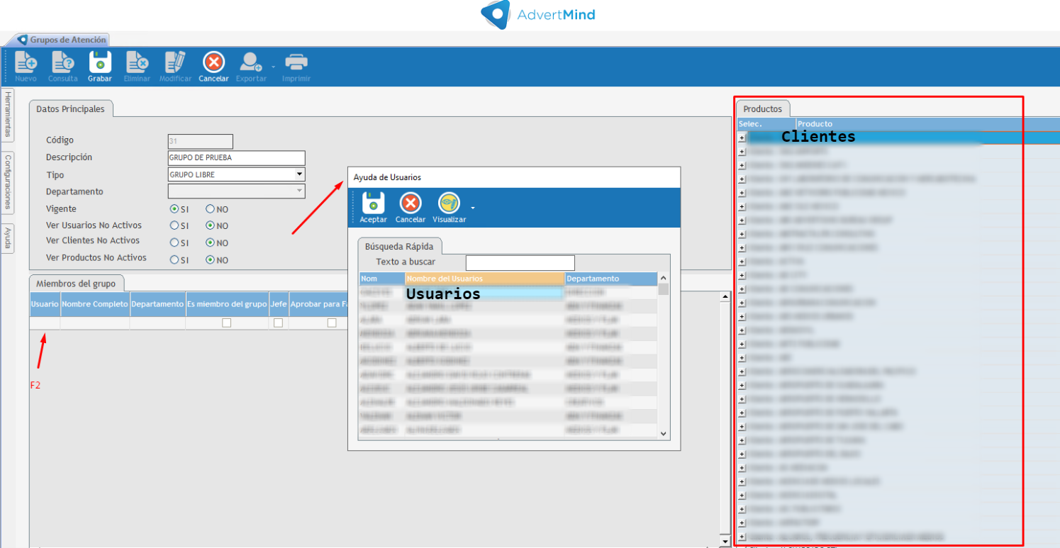 En la parte derecha de la pantalla, nos va a mostrar los clientes y sus diferentes productos para también seleccionar que cliente o clientes estarán dentro del grupo de atención.