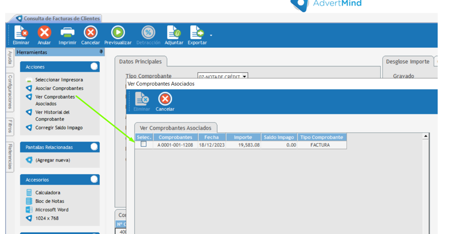 2. Al consultar la nota de crédito, en la solapa de “Herramientas”, se debe seleccionar la opción de “Asociar comprobantes”.