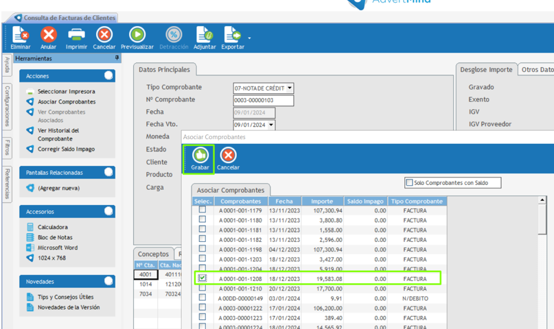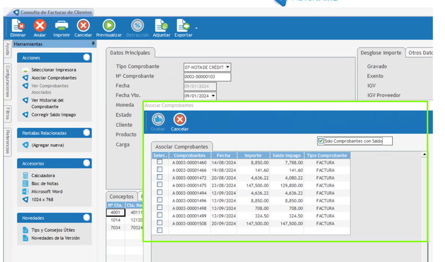 Para asociar comprobantes a una nota de crédito emitida, se deben realizar los siguientes pasos: