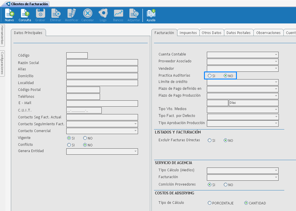 En el módulo Clientes de Facturación, el campo “Practica Auditorías” puede estar marcado como “Sí”.