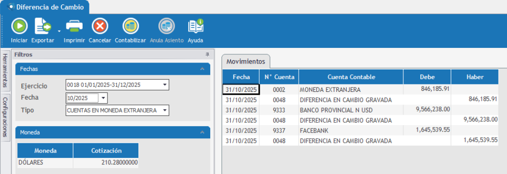 El sistema permite calcular a moneda local toda factura en moneda extranjera a un tipo de cambio único, y genera un asiento contable por ganancia o pérdida cambiaria.