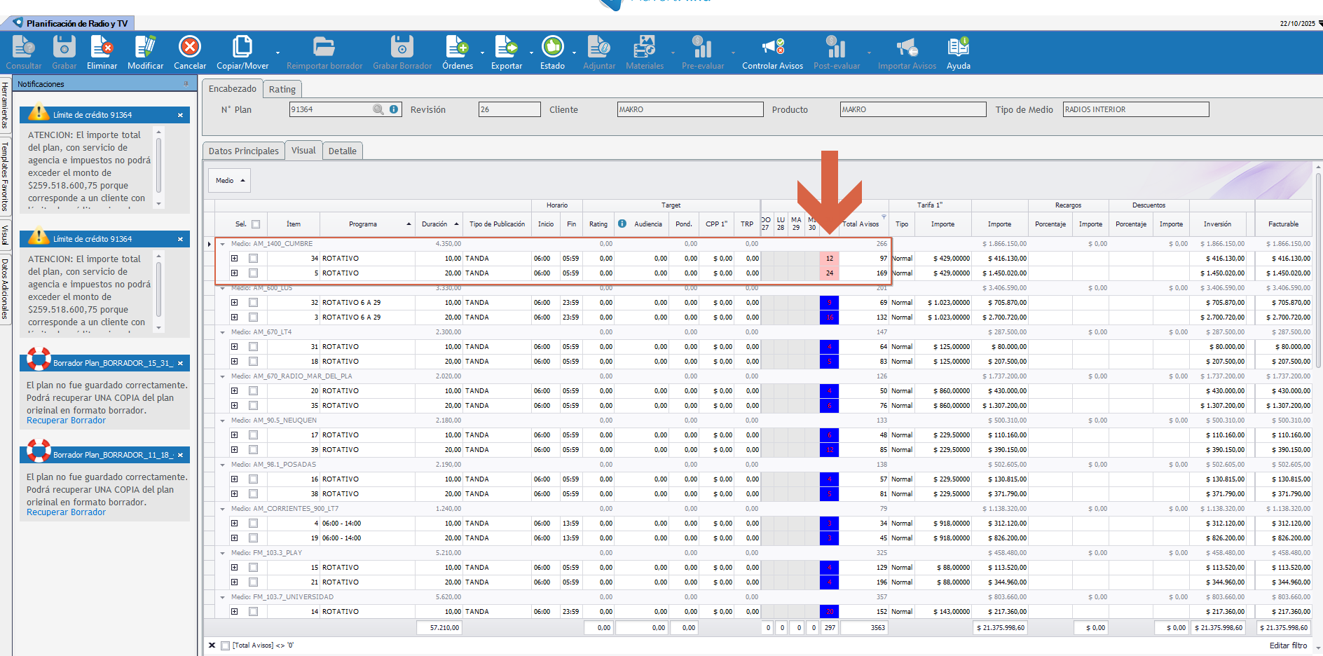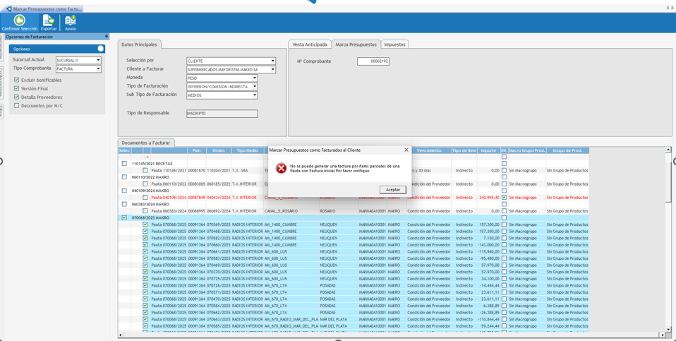 - Durante el proceso de facturación de una pauta desde la opción Marcar presupuesto como facturado, el sistema impide continuar, debido al siguiente mensaje;
