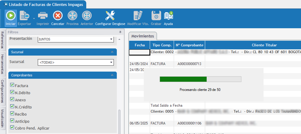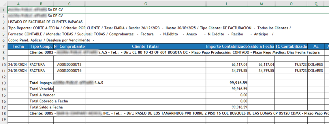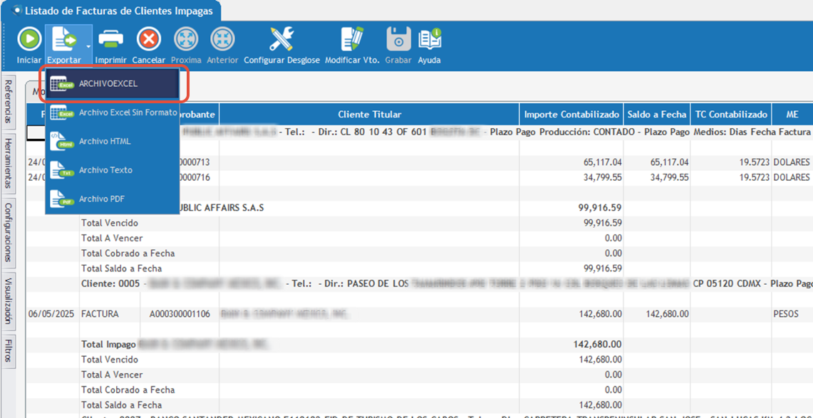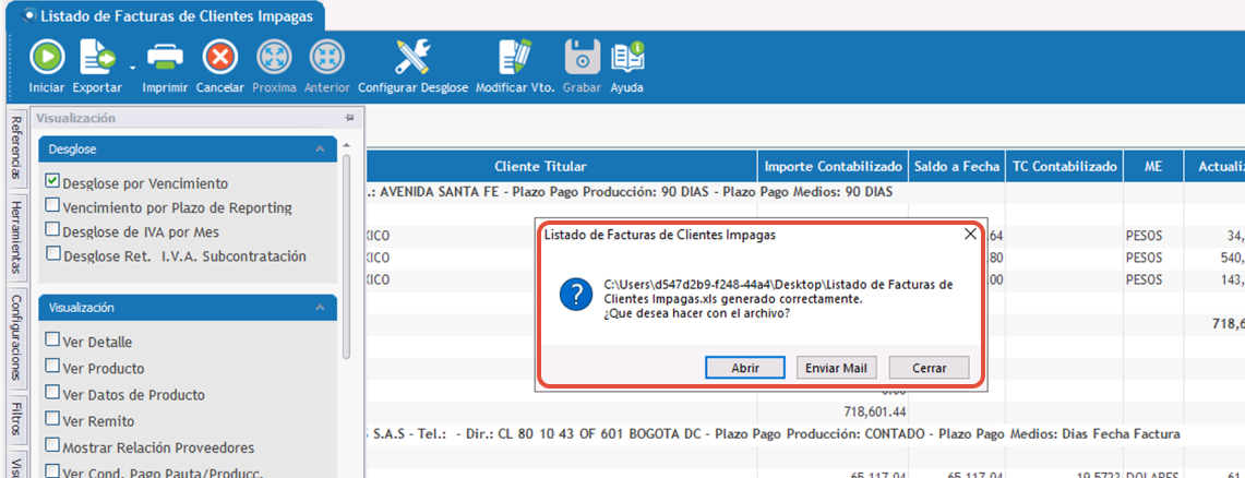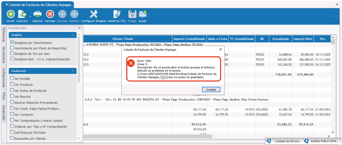 Al emitir un listado de facturas de clientes impagas, y luego seleccionar la opción Exportar archivo Excel, el sistema puede mostrar el mensaje mencionado por el antivirus. Se emite un listado de facturas de clientes impagas