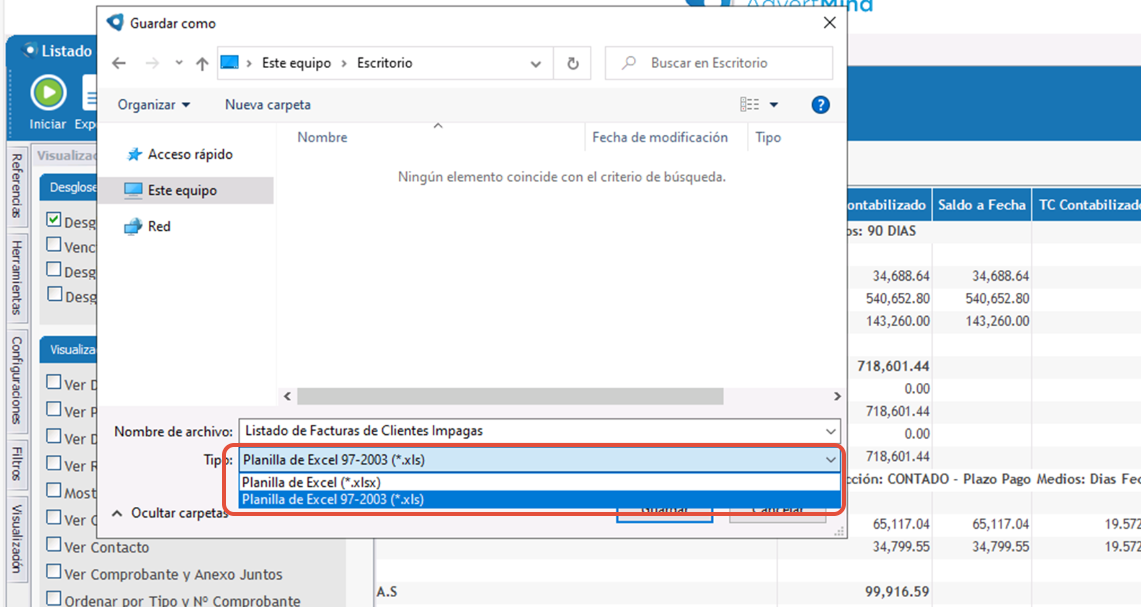 Seleccionar una versión anterior de Excel al momento de exportar.