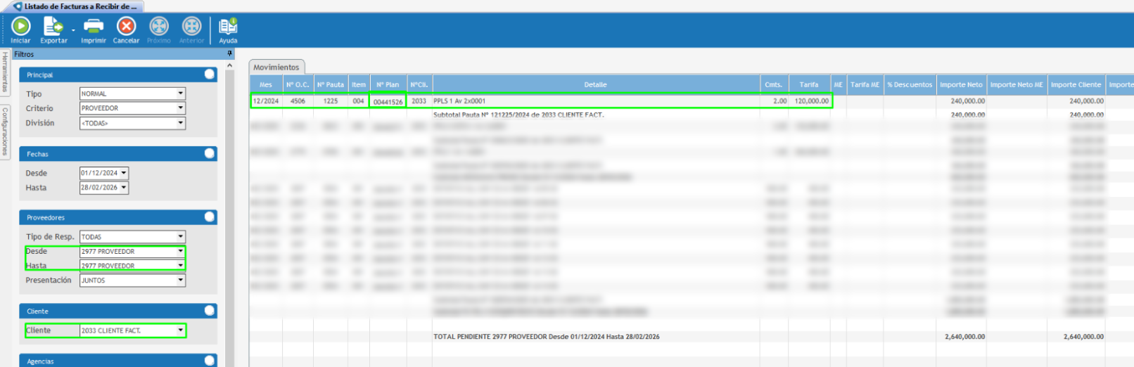 De esta forma, la orden de publicidad y también los pendientes de facturar van a figurar a nombre del proveedor broker, en este caso proveedor 2977.