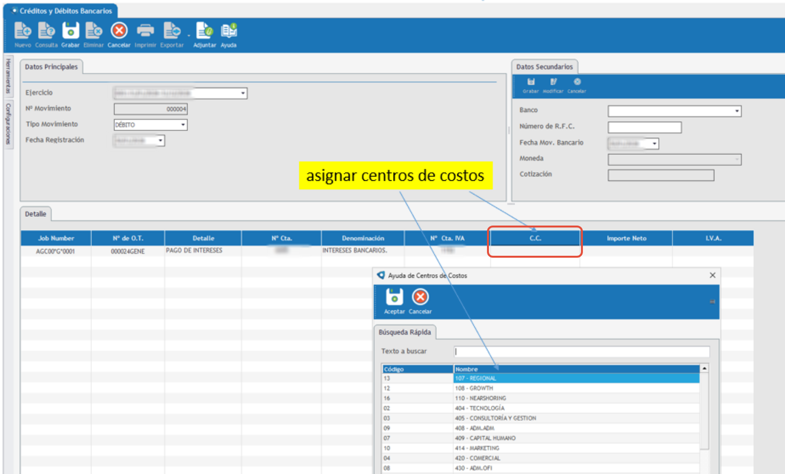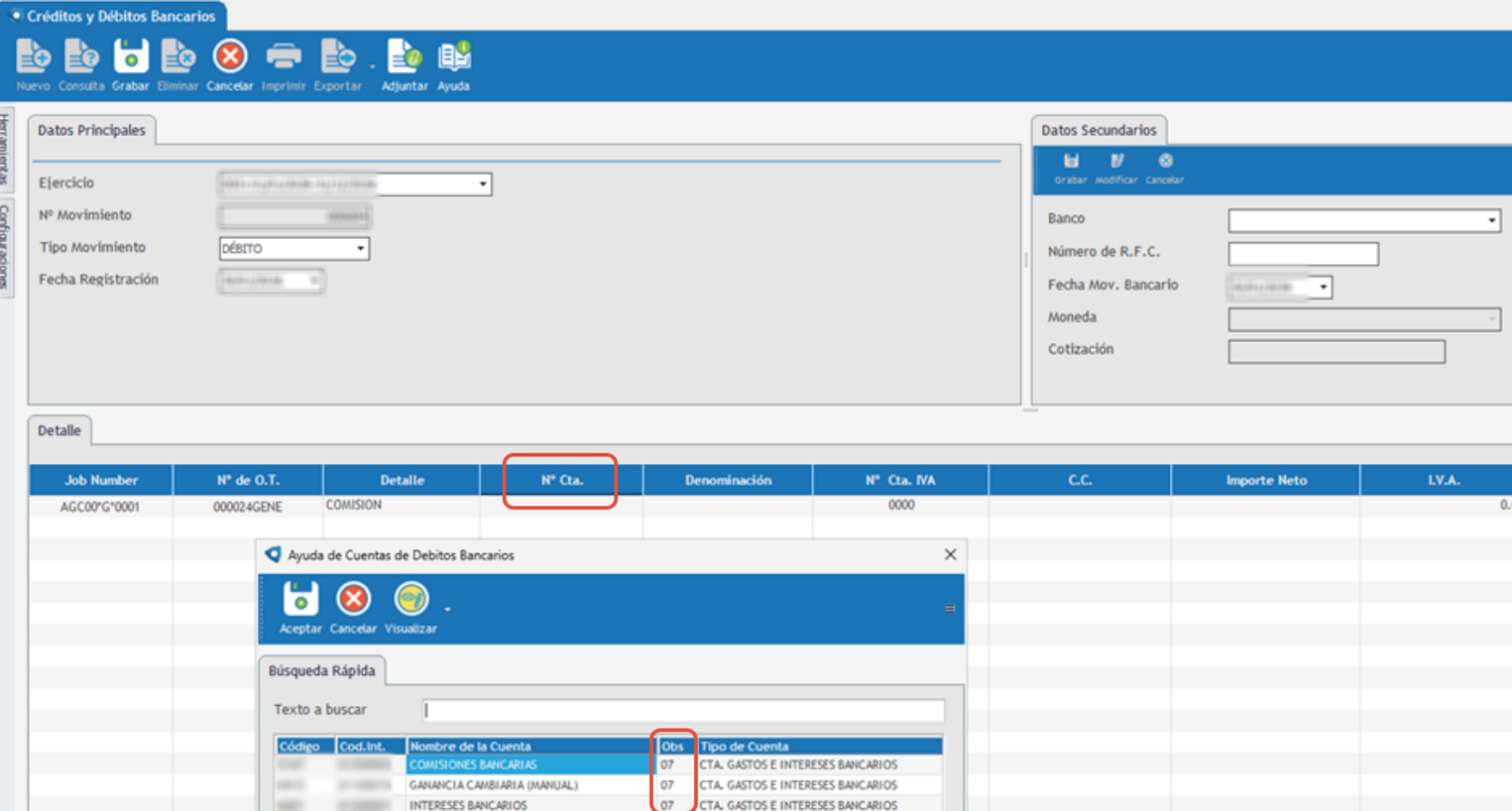 Al registrar un interés o comisión bancaria, se asignan cuentas contables con código de observación 07