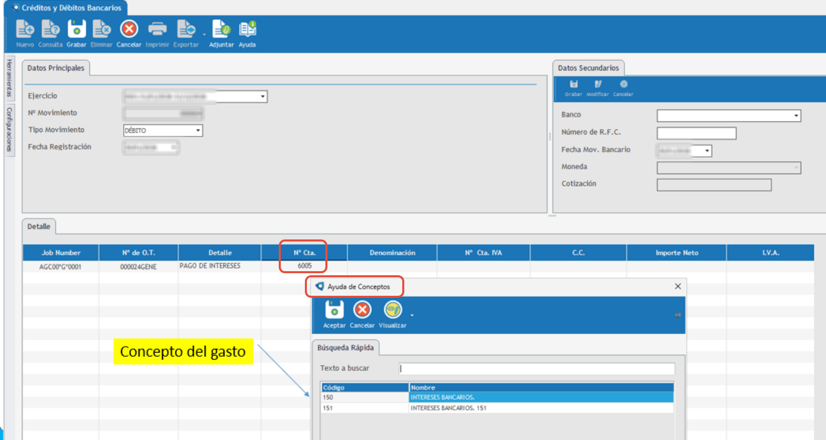 Después de seleccionar cuenta contable, aparece la ayuda de concetos