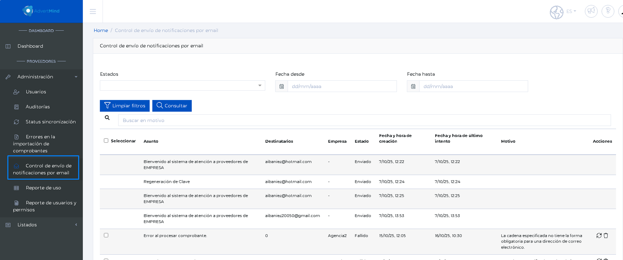 Para validar las notificaciones disponemos de un reporte dentro de liveranto para visualizar el estado de cada una.