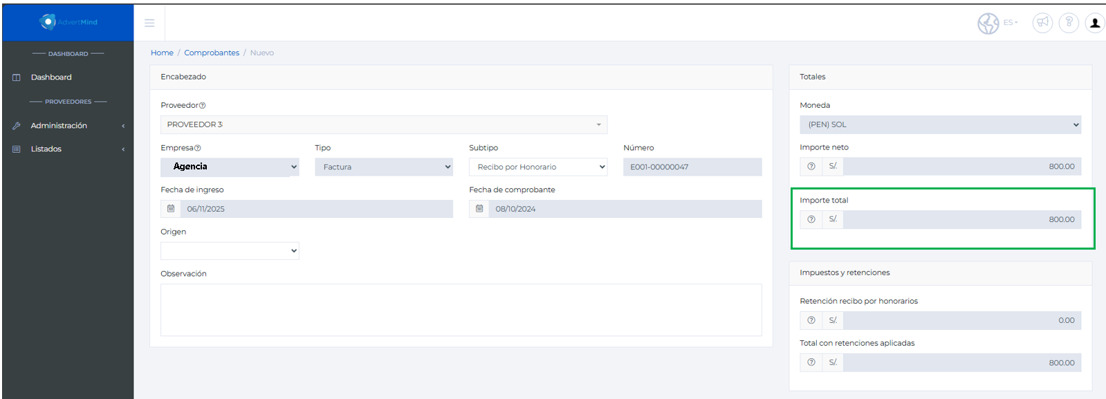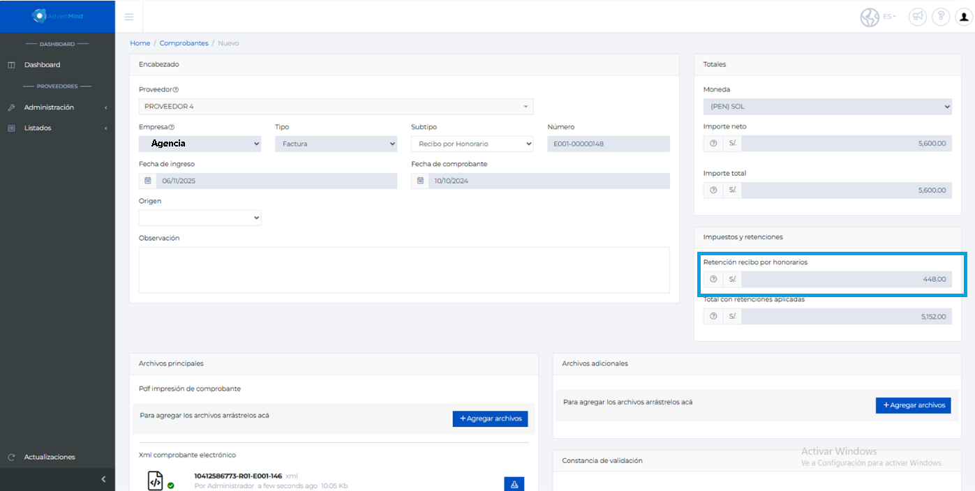 En este proceso, se cargarán los datos en forma automática: agencia, proveedor, fecha y número de comprobante, subtipo Recibo por Honorarios, el importe neto y el total.