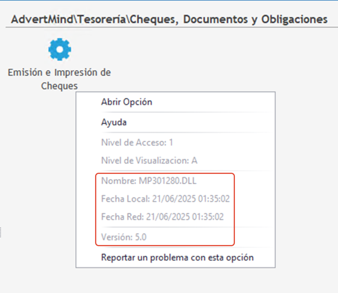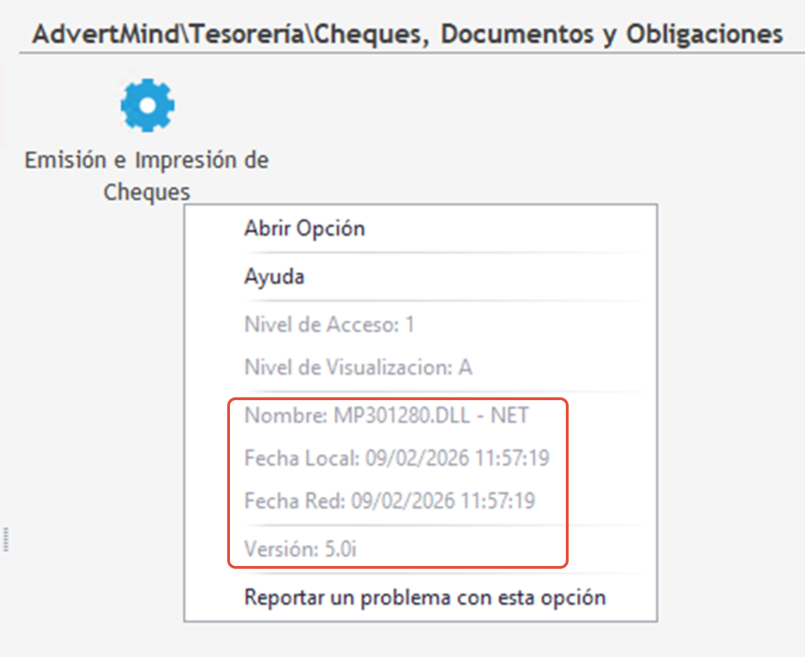 Por lo cual, la solución inmediata es regresar la pantalla de “Emisión e Impresión de Cheques” a la tecnología anterior; es decir, al cambiar de versión, la DLL de la opción (MP301280.Dll) viene marcada con la tecnología .NET y debe regresarse a la pantalla con tecnología .VBNET.