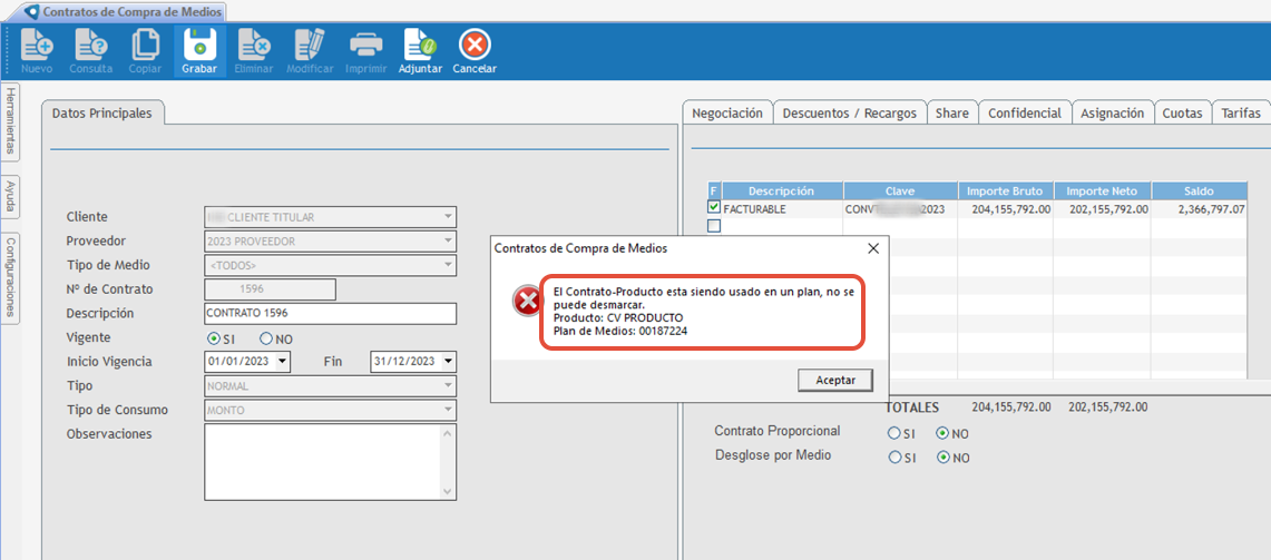 4. En ese momento, el sistema bloquea la operación indicando que el producto está siendo utilizado en un plan.