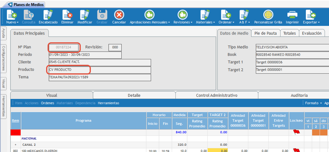 Al revisar el plan 187224, se confirma que efectivamente tiene asignado el producto CV PRODUCTO.