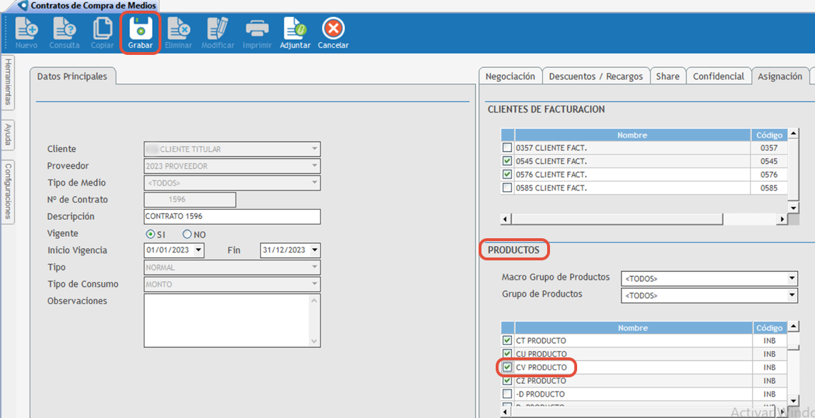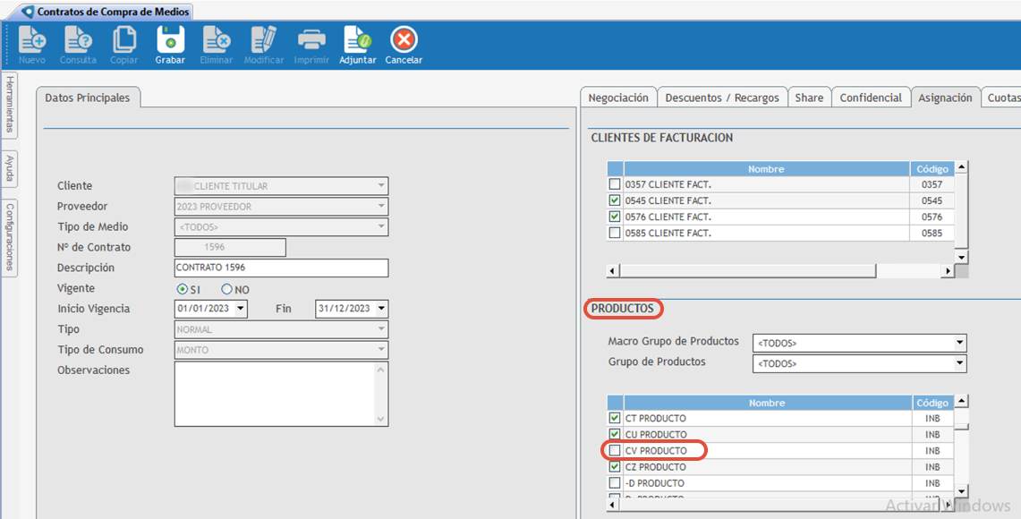 Una vez que el producto CV PRODUCTO queda correctamente asignado en el contrato: