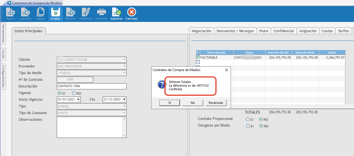 Se intenta aumentar el monto de un contrato, pero el sistema no permite grabar la modificación y muestra el siguiente mensaje:
