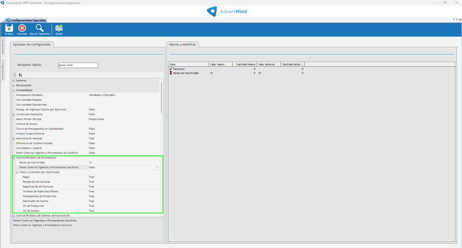 •Volver a ingresar y consultar el control periódico, en proveedores se habilito una nueva configuración que pone como no vigente a los proveedores, si se habilita en el momento de inactivar los pone no vigentes.