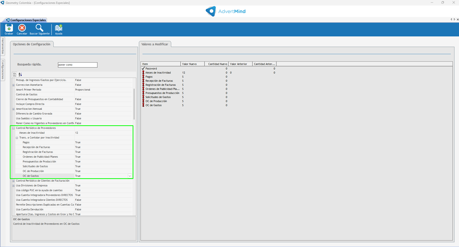 •Se brinda la posibilidad de efectuar el control en forma automática habilitando una Configuración Especial, donde se debe incorporar la cantidad de meses donde va a controlar si hay actividad. En caso contrario, cambia el estado del proveedor o cliente.