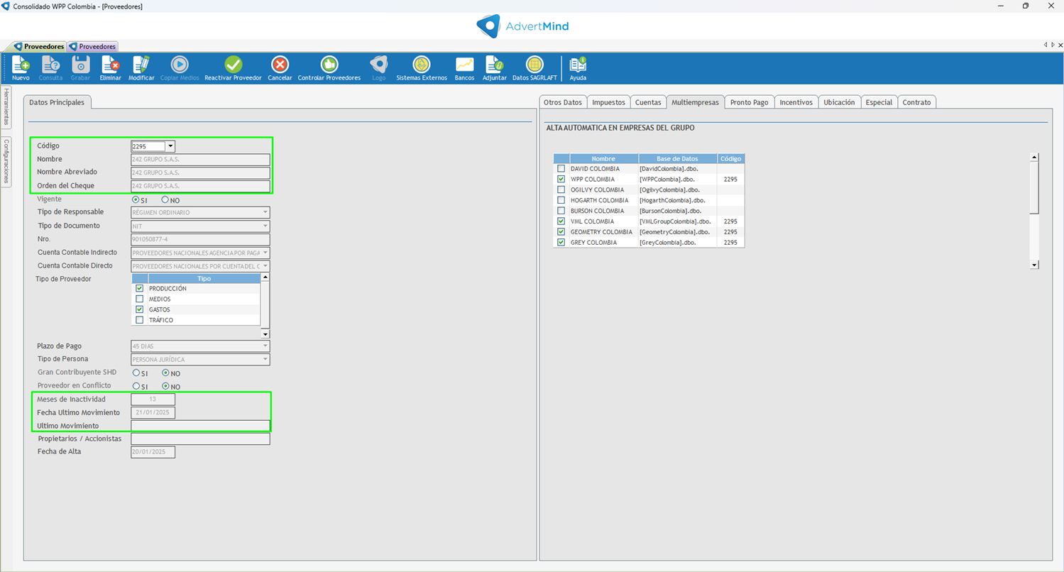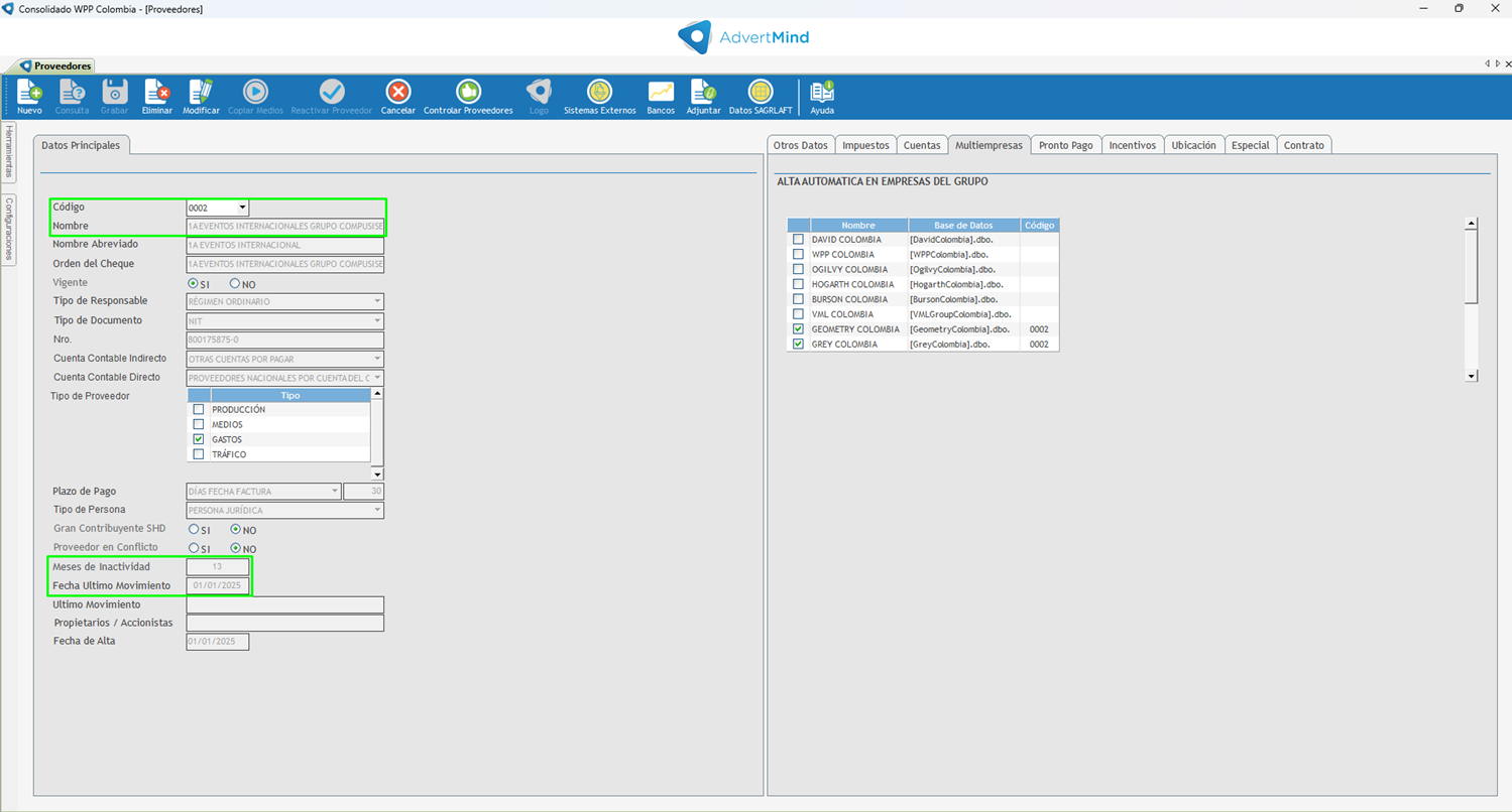 Consultamos un proveedor y vemos que ahora tenemos un campo de meses de inactividad y la fecha de la ultima actividad