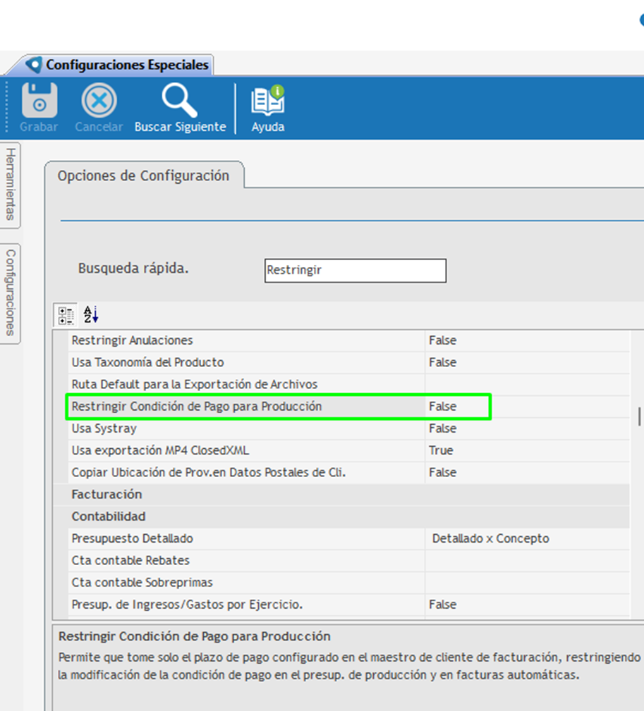 Cuando esta opción se establece en TRUE, el sistema tomará siempre la condición de pago definida en el maestro de clientes de facturación, independientemente de la condición de pago indicada en el presupuesto.
