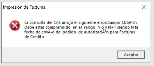 Este error es bloqueante. Es decir, el organismo regulador impide técnicamente la generación del número de factura y del CAE hasta que la fecha del comprobante se ajuste al rango permitido.
