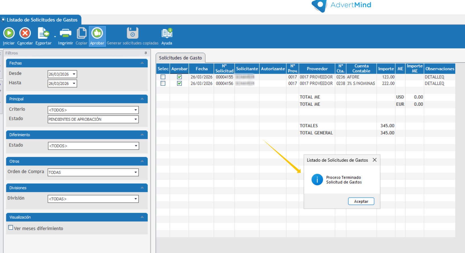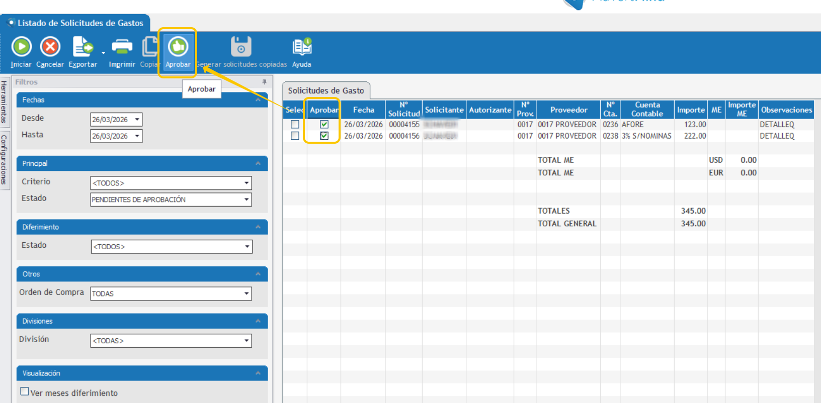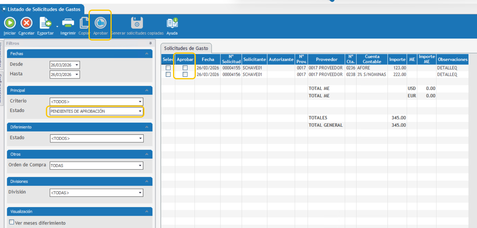 El sistema cuenta, actualmente, con forma de seleccionar más de una solicitud de gasto pendiente de aprobar y realizar la acción de aprobación de forma masiva. Las condiciones son que la solicitud debe estar pendiente y que el usuario tenga permisos de aprobar gastos de otros usuarios.