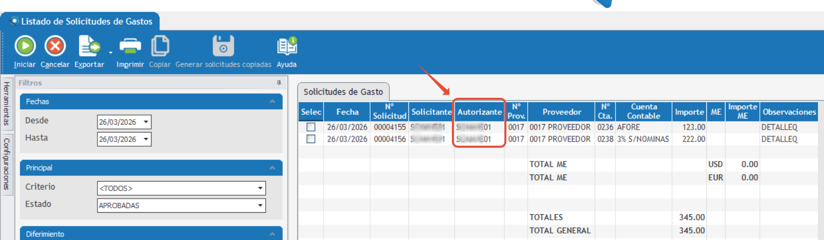 Después, se puede ir al "Listado de Solicitudes de Gastos". Emitir solo las que tienen estado "Pendiente de Aprobación".