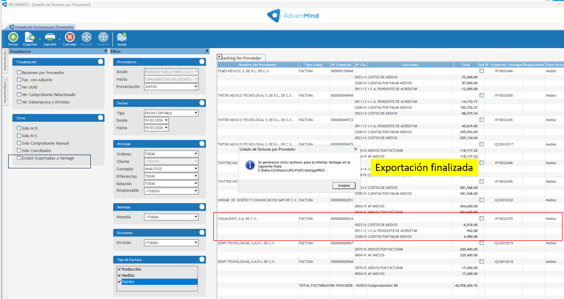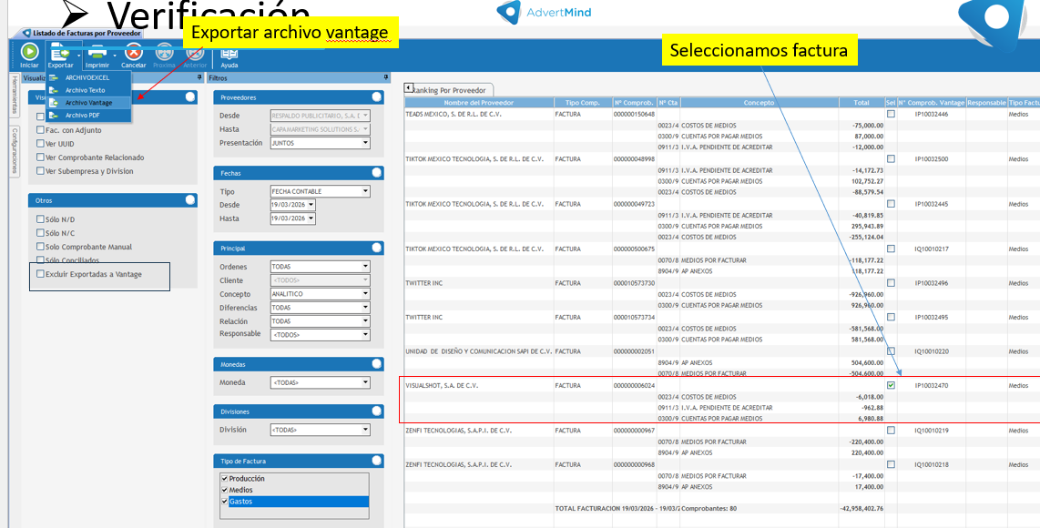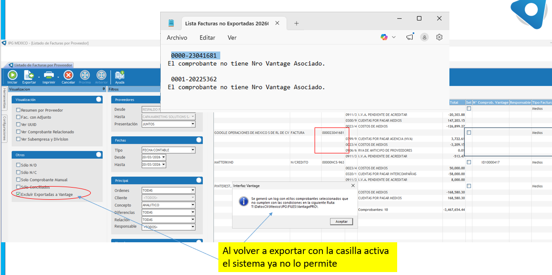 Con la casilla "Excluir exportación a Vantage" el sistema valida que la factura tenga número Vantage asociado, pero si no lo tiene no permite exportar.