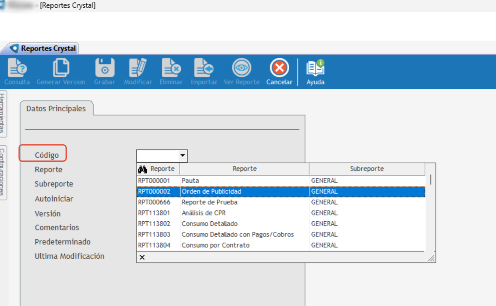 Entrar la opción Reportes Crystal: