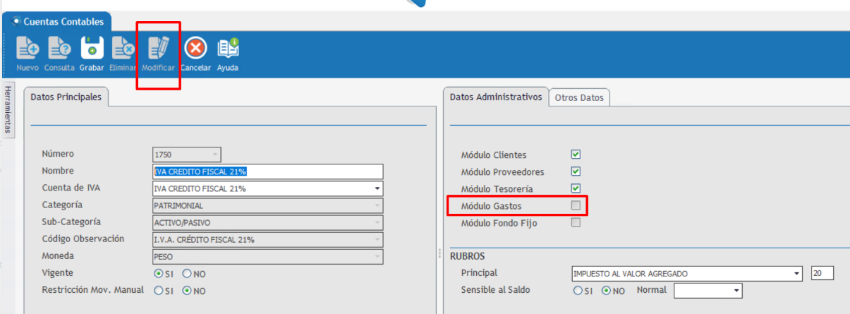 En algunos casos, al consultar una cuenta desde el módulo Cuentas contables, la opción “Módulo gastos” no se encuentra disponible para su modificación. Esta situación se presenta específicamente en las cuentas patrimoniales: