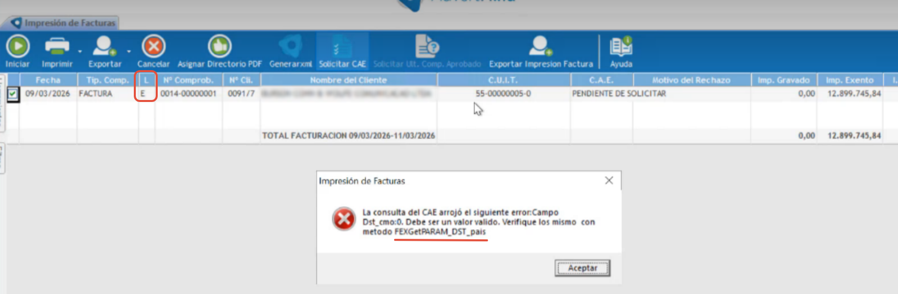 En ciertas ocasiones puede recibirse un aviso por parte de ARCA en el que deniega la devolución del CAE para facturas de exportación. En ese aviso se menciona un campo en 0 que no corresponde (FEXGetPARAM_DST_pais):