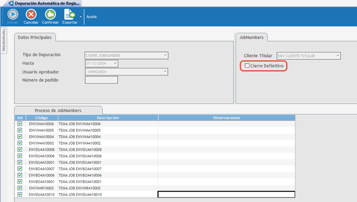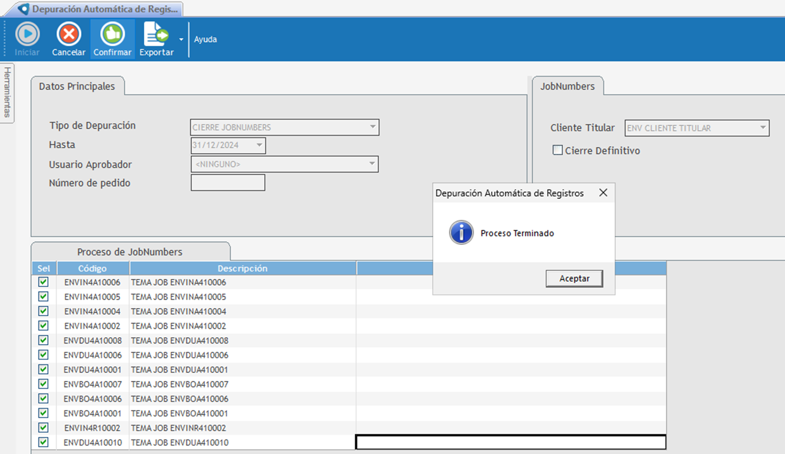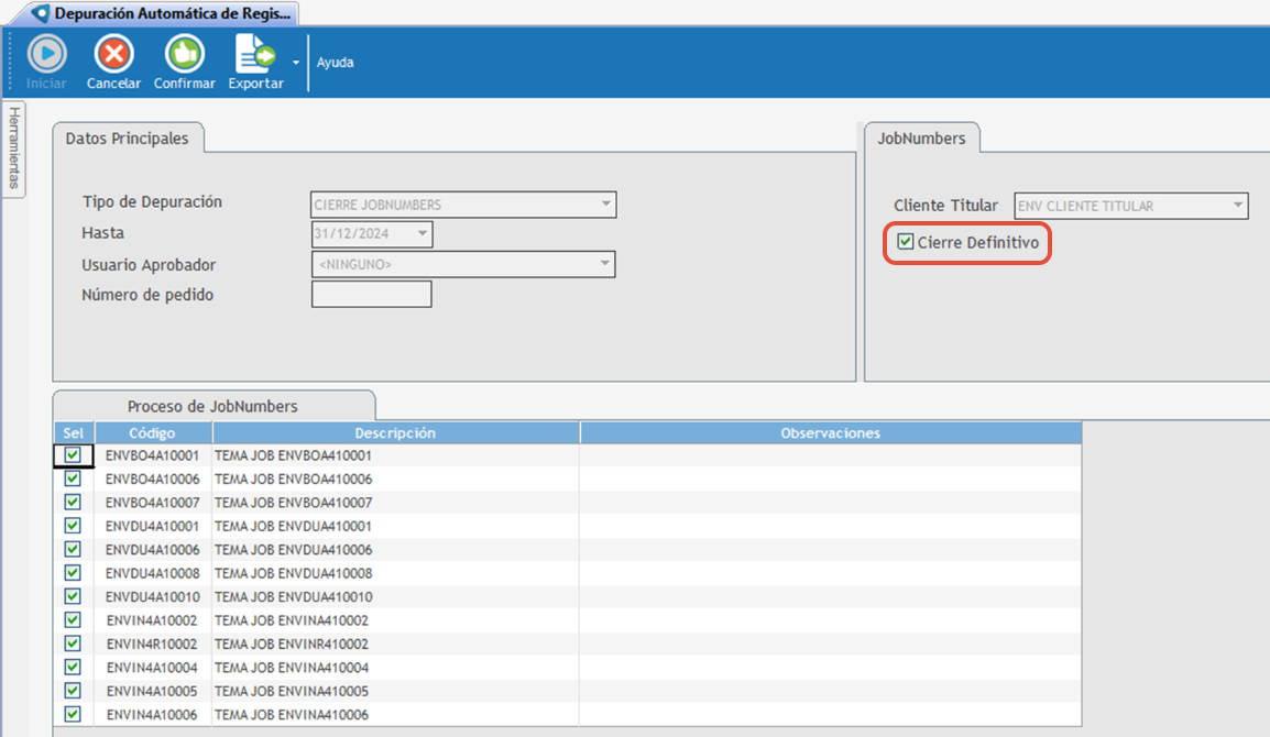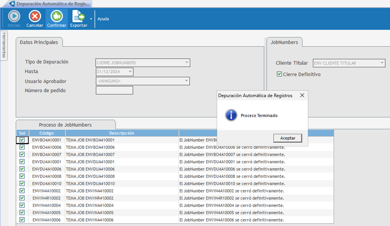 Luego, se ingresa a la opción de Depuración y se solicita el listado de Jobs a cerrar con la opción de Cierre Definitivo seleccionada. A continuación, se presiona Confirmar.