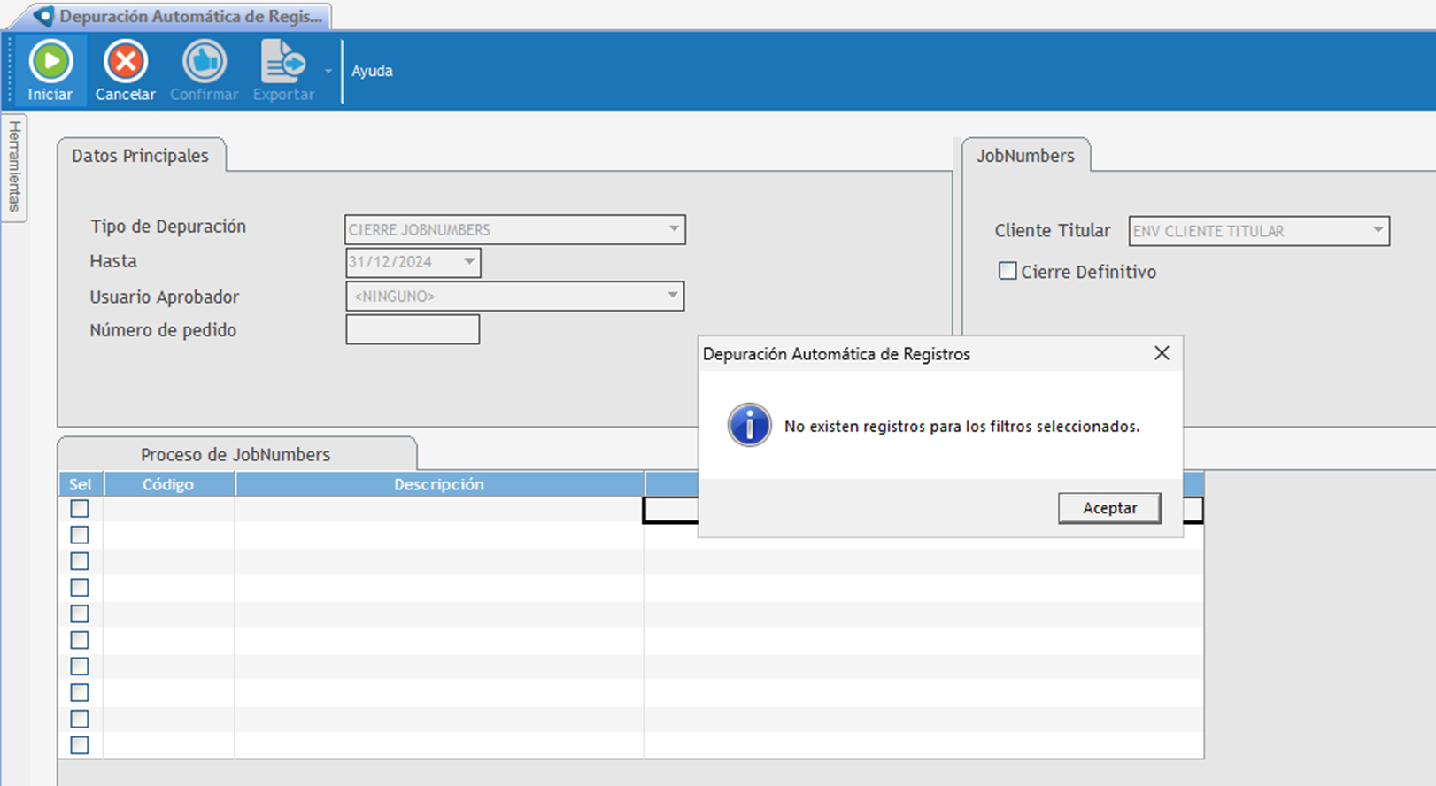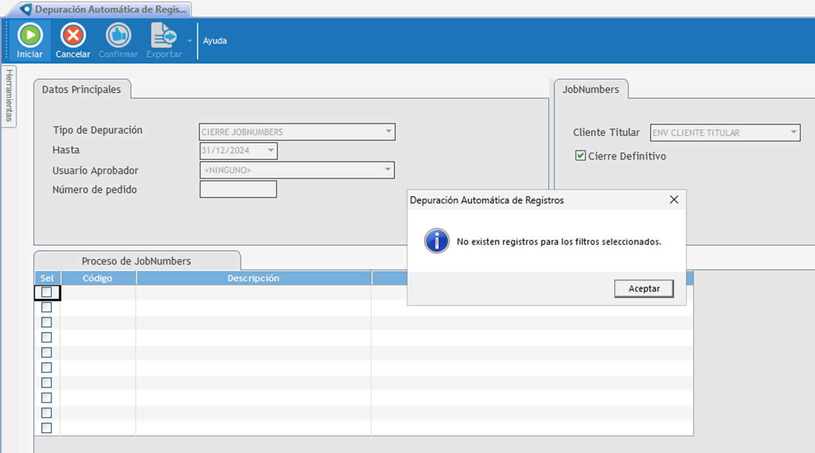 En el sistema existe una opción llamada “Depuración Automática de Registros”. Sin embargo, no se trata de un proceso que cierre los Jobs automáticamente sin verificación previa. Para ello, se deben tener en cuenta varios puntos, equivalentes a los pasos que se realizan cuando los cierres se hacen de manera manual.