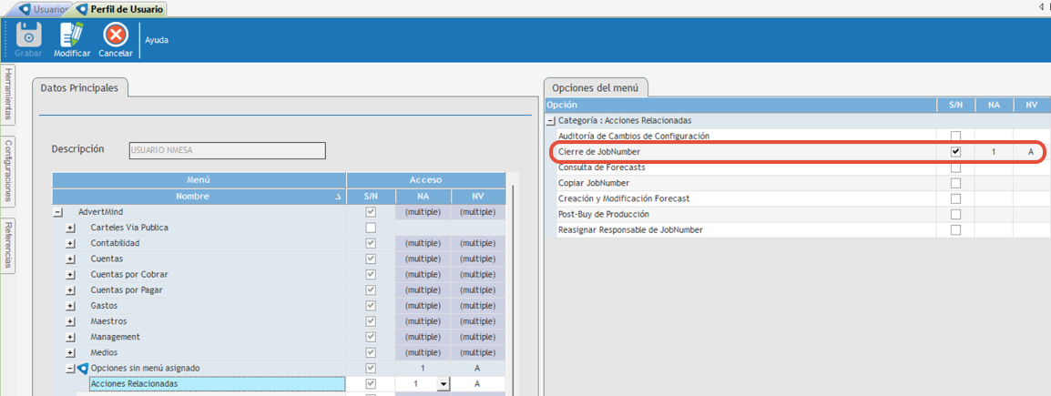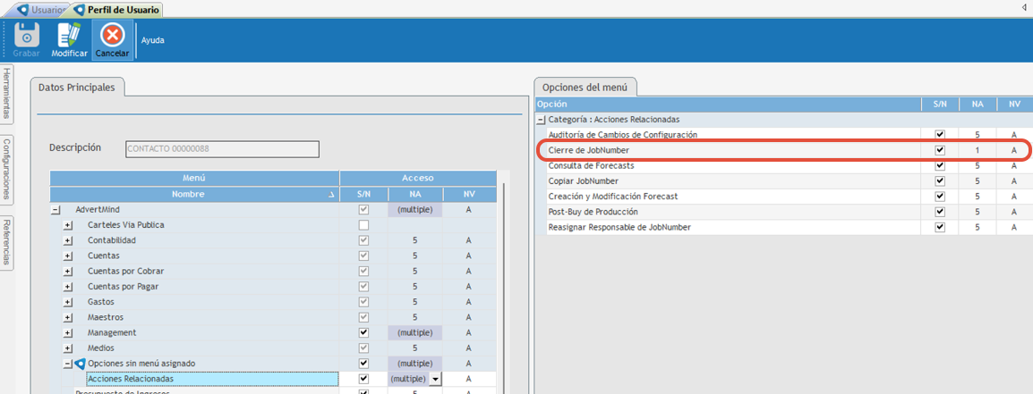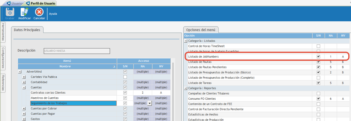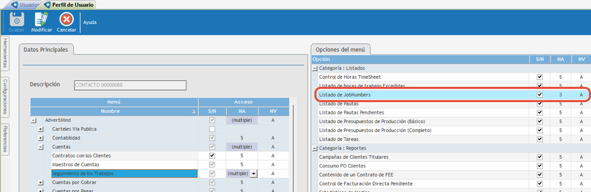 También se debe verificar que tenga la opción “Listado de JobNumbers” al menos con nivel 3-A.