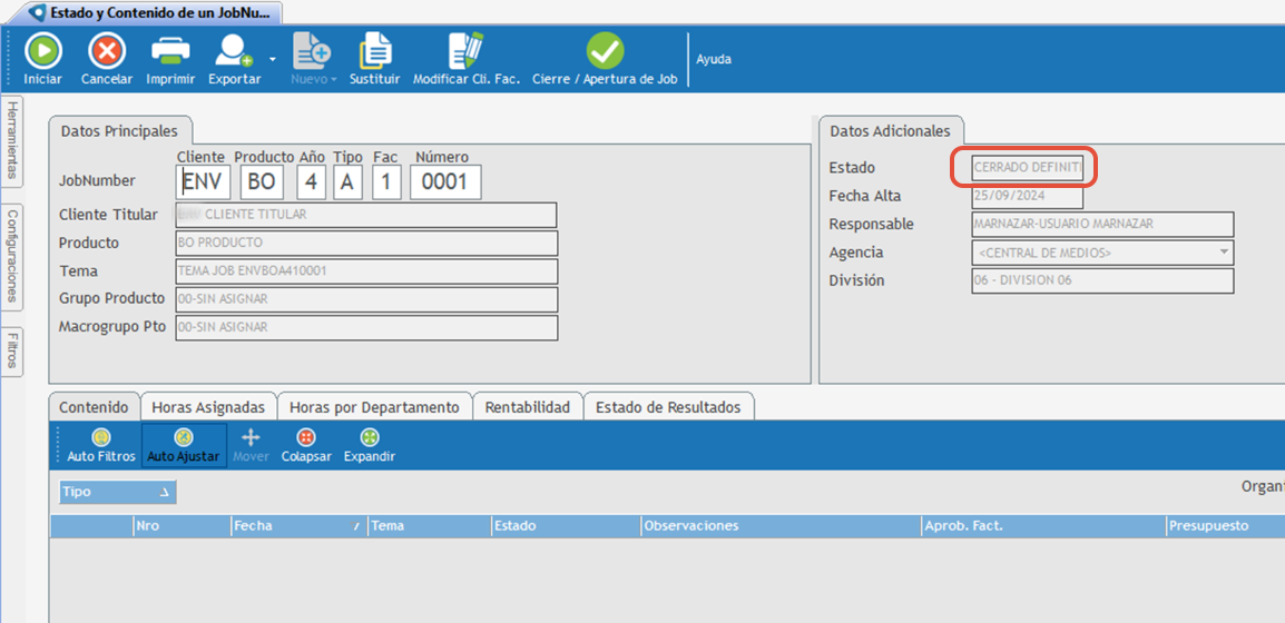Si se consulta alguno de los Jobs que aparecían en el listado para cerrar, se podrá verificar que su estado es CERRADO DEFINITIVO.