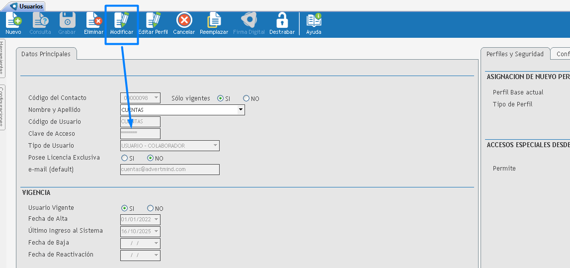 Debe presionar modificar y se habilita ingresar un nuevo password o contraseña, al grabar le debe solicitar al usuario que utilice la misma que es provisoria y deberá modificar.