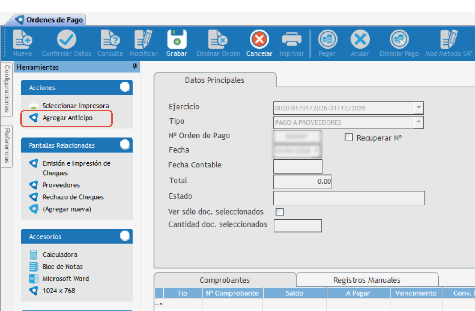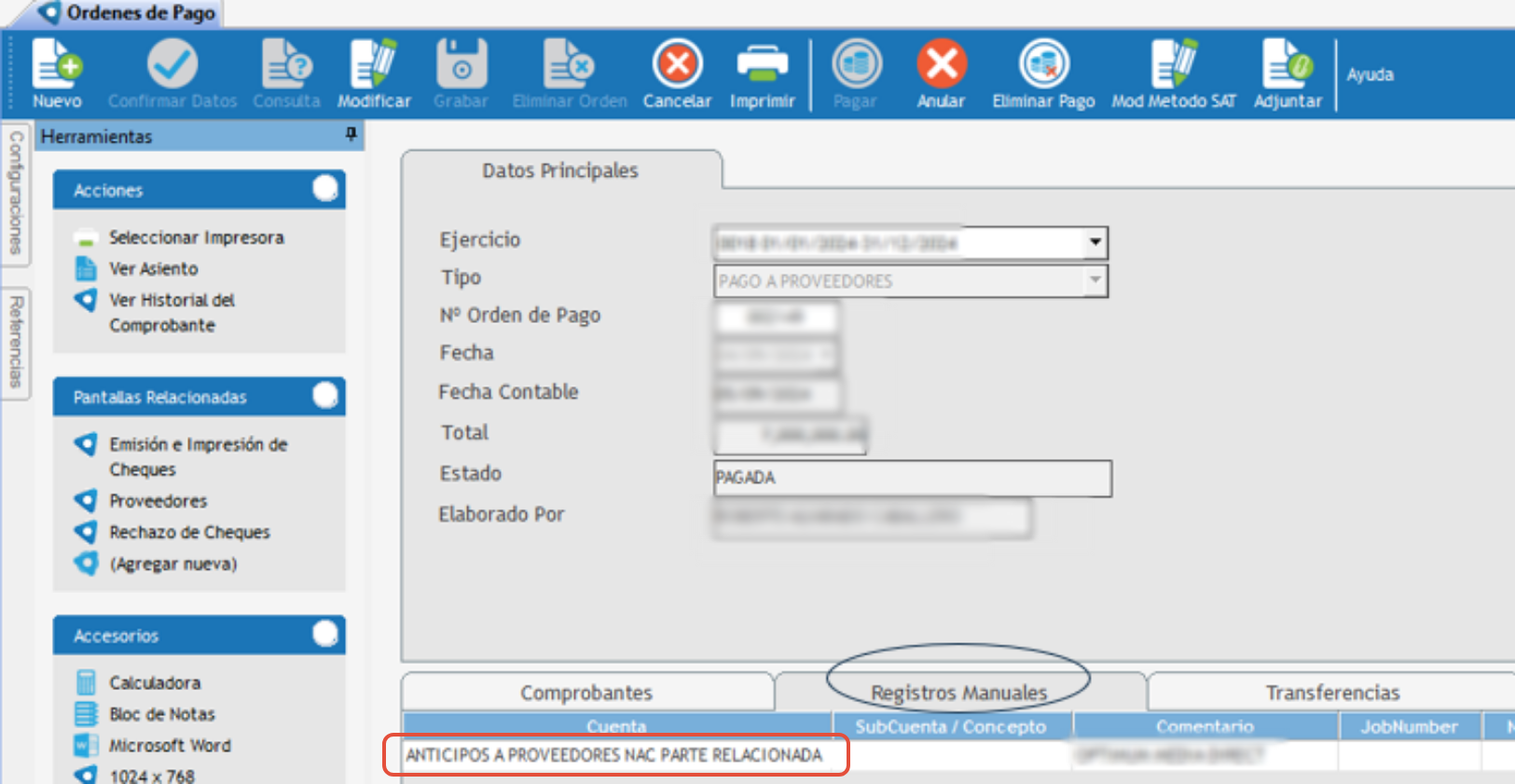 4. Al guardar la orden de pago y antes de elegir banco, el sistema asigna la cuenta de anticipo en la solapa de REGISTRO MANUAL.