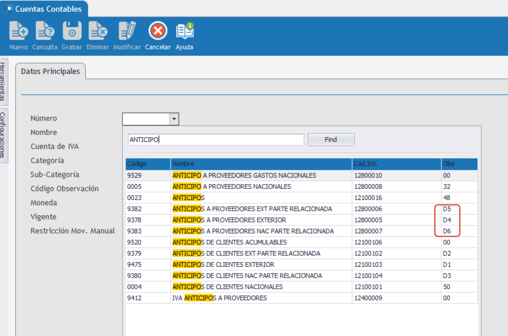 1. Se requiere generar las cuentas contable con los códigos de observación D4, D5 y D6.