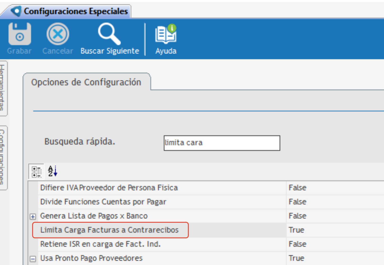 Para poder desactiva el Tráfico de facturas de proveedor, se debe ingresar a Configuraciones Especiales y desactivar (en False) la opción: Limita Carga Factura a Contrarecibos.